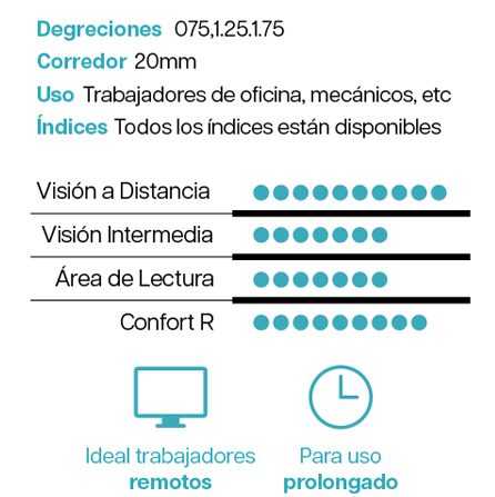 Aporta flexibilidad a la gama de lentes ocupacionales, brinda el poder de definir la visión a distancia, complementa la gama de lentes Office al ofrecer una lente de trabajador remoto, las principales ventajas de un diseño de oficina sin obstaculizar la visión en interiores para ayudar a administrar otras tareas domésticas. Además cuenta con tecnología de Descentración Variable, OptiEdge, OptiPrism. Distancia máxima de visión 2 metros.